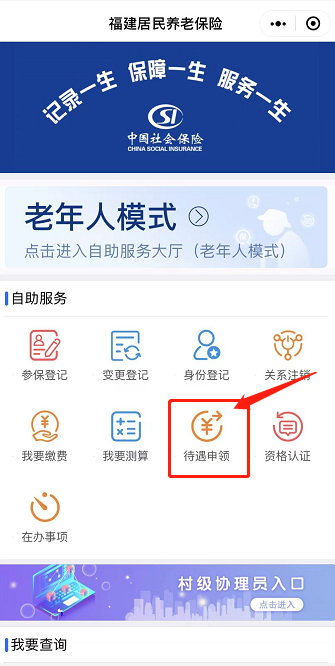 进入福建省人民政府网站首页——选择“办事服务”——选择户籍所在地——选择“我要办”——选择“个人办事”——选择“按主题分类”——选择“社会保障”——选择“养老服务”——选择“城乡居民养老保险待遇申领”——选择“在线办理”——完善基本信息——提交审批。