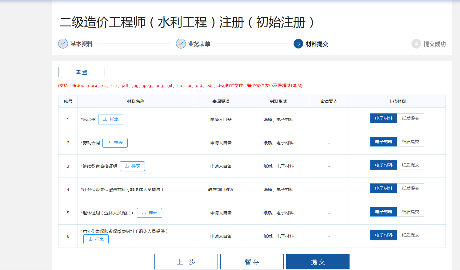 (6)进入申报页面/材料提交,上传材料选择“电子材料”,上传材料,选择“提交”即申报成功