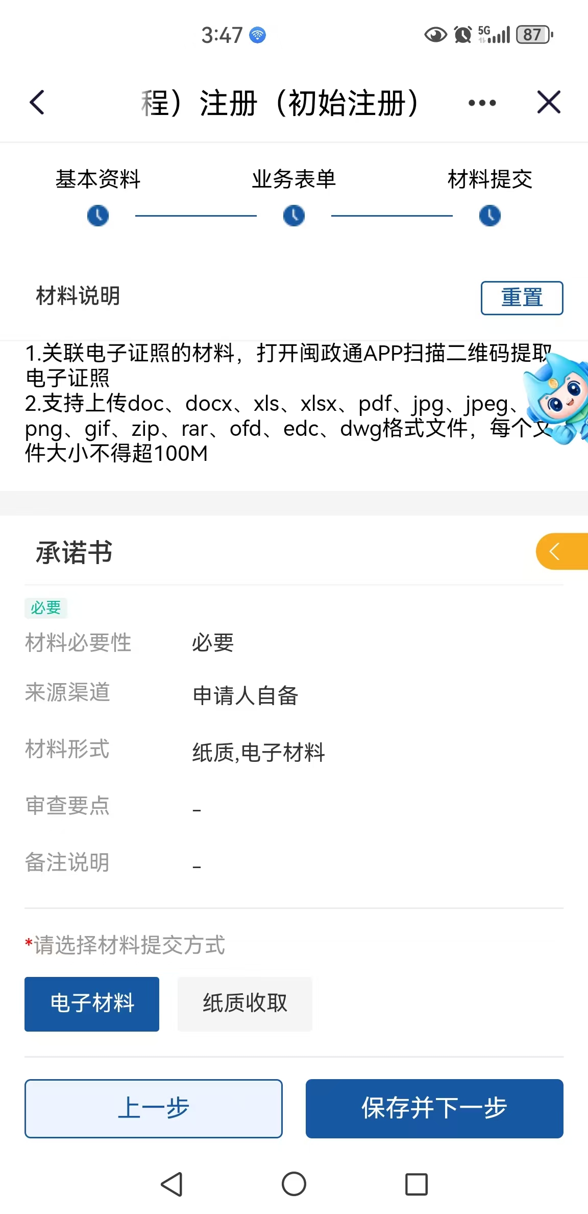(4)材料提交选择“电子材料”,按照要求上传材料,选择“保存并下一步”即申报成功