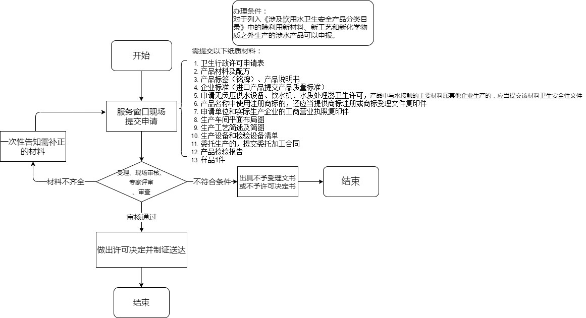 涉及饮用水卫生安全产品许可申请单位或个人按照要求提交材料齐全,生产现场审核应当核查生产企业是否符合卫生要求,申报产品生产是否与申报材料一致,省级卫生健康行政部门作出卫生行政许可决定。