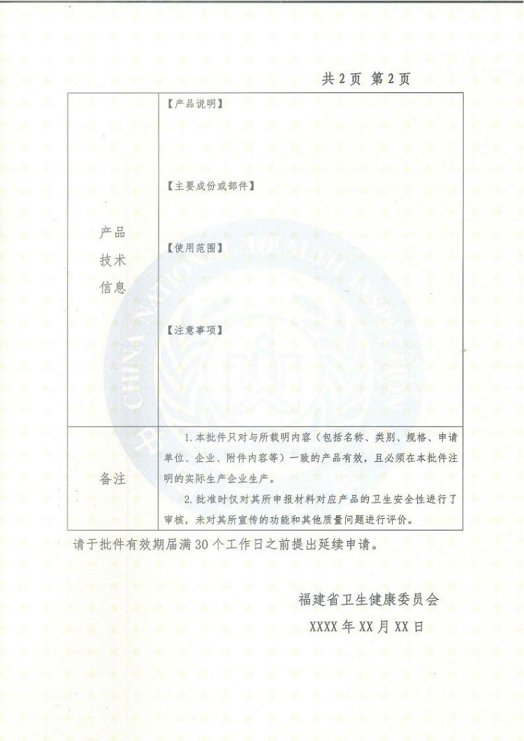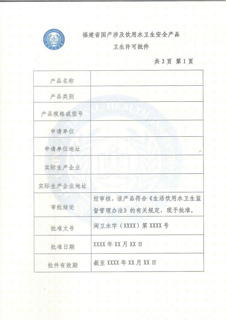 《福建省国产涉及饮用水卫生安全产品卫生许可批件》,样式如下图。