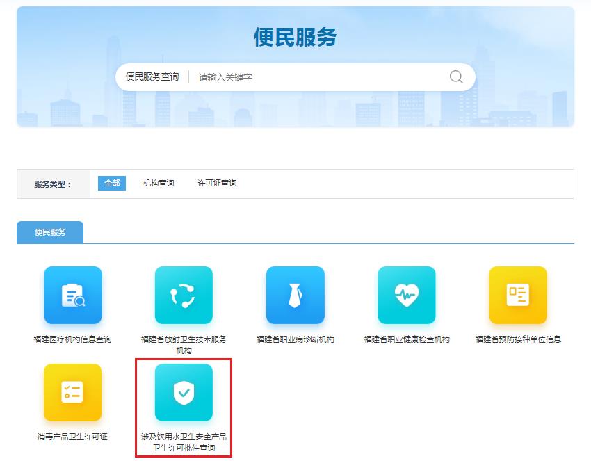 2.登录福建省卫生健康委员会官网,点击首页“办事服务>便民服务”栏目的“涉及饮用水卫生安全产品卫生许可批件查询”进行查询。