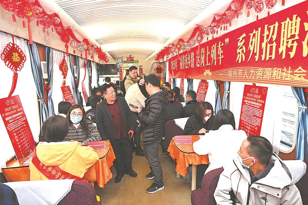 “我打算春节后来福州找一份新工作,没想到返乡列车上开起了招聘会,真是方便。”车厢里,饶先生和多家企业深入交流,经过一番认真筛选后,他定下了满意的新岗位。