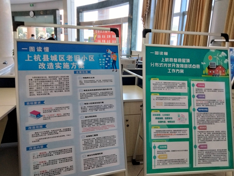 (三)设置政策咨询服务区。专区提供政策咨询解读和政策咨询服务,政策咨询服务区域标识清晰。编制《上杭县2022年政策解读文件汇编》放置服务台,并以展板的形式公开了《上杭县城区老旧小区改造实施方案(图解)》《上杭县整县屋顶分布式光伏开发推进试点县工作方案(图解)》《上杭县进一步支持5G网络建设和产业发展十条措施(图解)》等,同时通过LED电子屏播放相关政策解读信息,更好地宣传重要政策;