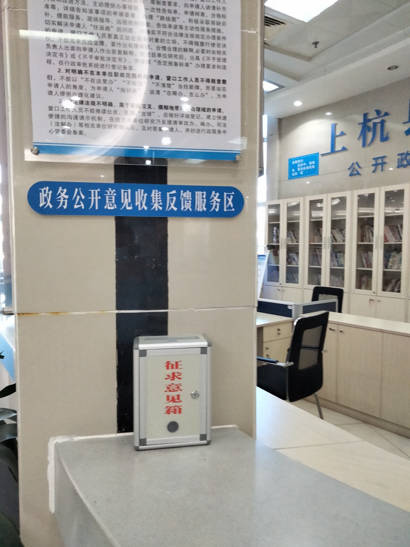 (四)设置政务公开意见收集反馈服务区。专区提供政务公开意见收集反馈服务,决策征求区标识清晰,在显著位置放置征求意见箱,建立和公开《上杭县政务公开意见收集反馈处理制度》和《上杭县政务公开意见征求渠道和意见反馈渠道》等,广泛征求群众对政务公开工作的意见建议,进一步改进和提升政务公开工作服务水平。