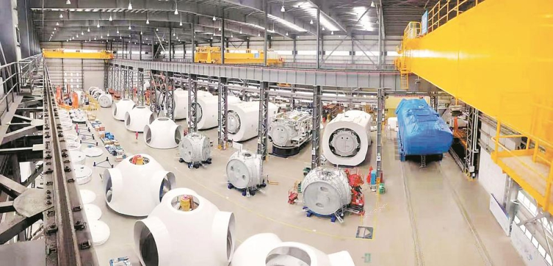 三峡海上风电国际产业园内一家企业在生产风力发电机组。