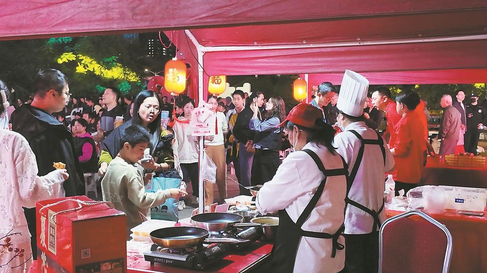 表演还未开始,舞台两旁的摊位早已是一派热火朝天的景象。“红团红团,好吃的红团。”莆田红团摊主周志健一边吆喝一边掀开蒸笼盖子,热气瞬间弥散开来,一颗颗鲜红诱人的红团展现在众人面前。“我们下午就早早过来出摊,现在已经卖了100多份。”周志健喜笑颜开。