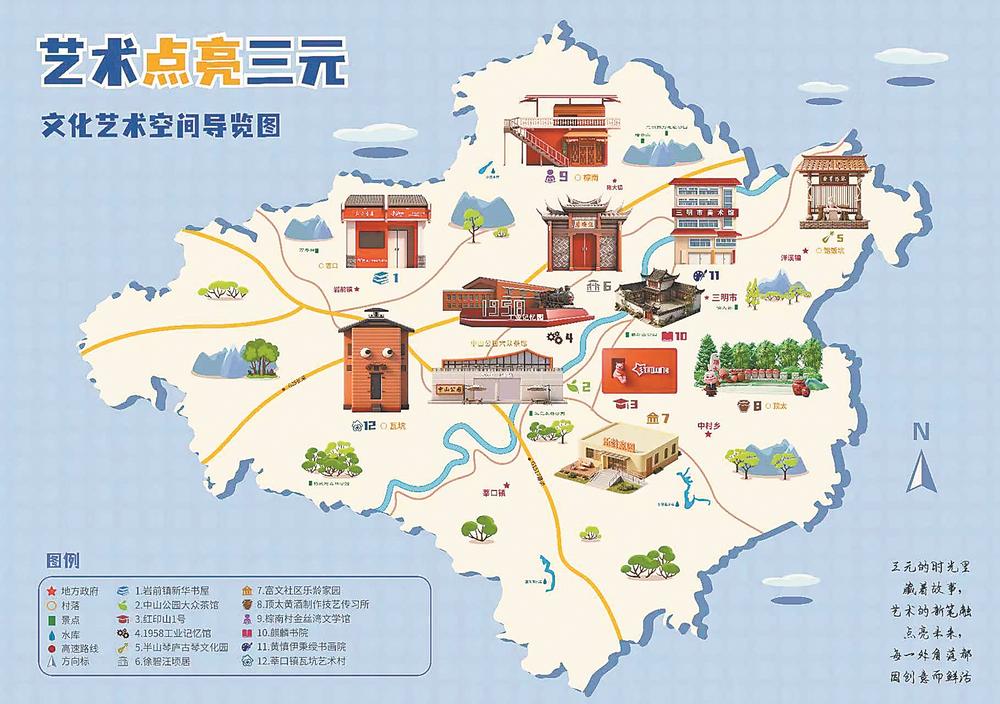 自2025年开始,以“文艺赋能城乡”为主线,三明市通过整合文艺文化空间资源,选取位于三元区的12个兼具文化底蕴与空间活力的点位,绘制精品文艺活动点地图,构建起“城市漫游+乡村浸润”的双线文化地图。