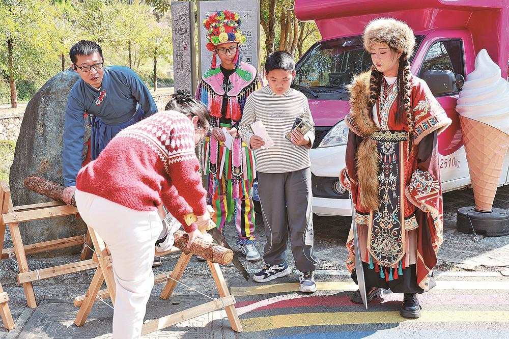“剧本游只是一种形式,互动强、有趣味才是关键。”剧本游现场执行导演张金梅表示,为让游客获得更强的体验感,剧本游不仅设计了多样化的互动游戏,确保老中青幼各类人群都能参与其中,还着重植入本地非遗元素,让游客在“剧中游”的同时,能够品尝非遗米香、学习竹竿舞和抛陀螺等。此外,活动还开展甲胄巡游、国风走秀等环节,让游客能够看演艺、玩剧本、做文创,全方位沉浸在土楼文化与国潮体验之中。
