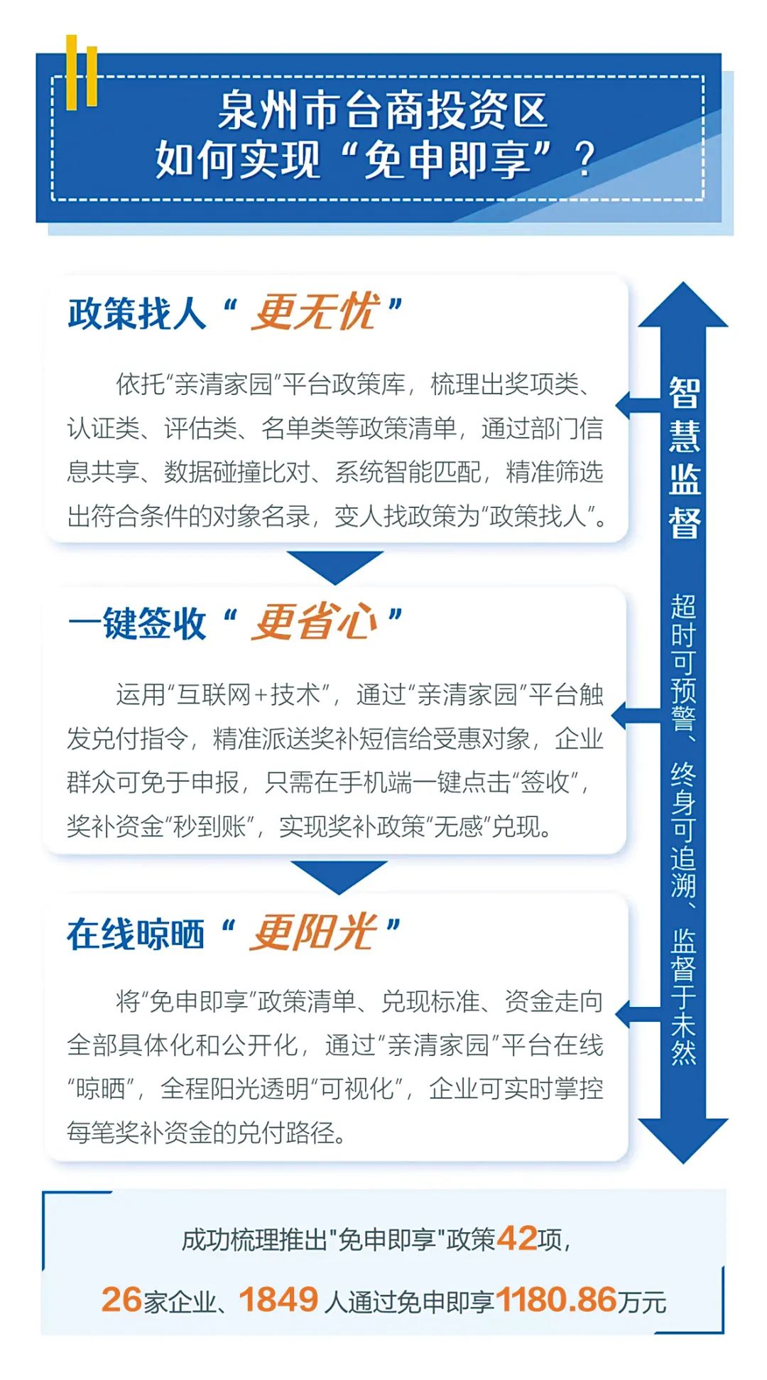 由市纪委监委点题改革,台商投资区党工委、管委会一把手挂帅,区纪工委监工委、行政服务中心承办,建设“亲清家园”掌上智慧监督服务平台,推行惠企惠民政策兑现“掌上提、在线批、直达付、全程督”。目前,累计上线政策42项,26家企业“免申即享”10项惠企政策,共奖补382万元;1849人“免申即享”11项惠民政策,共奖补798.86万元。