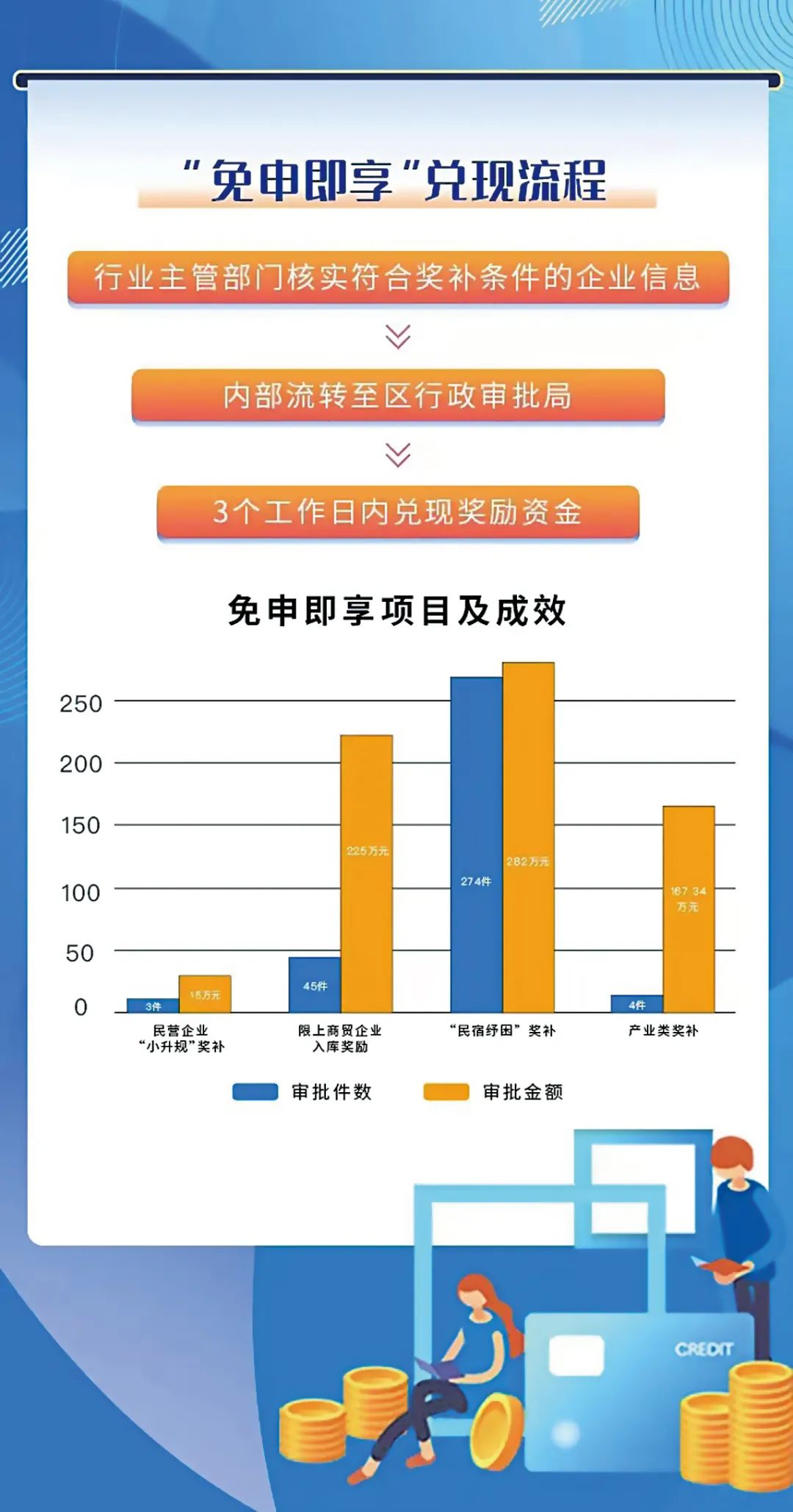 由区党工委、管委会主办,区行政审批局、经济发展局、税务局承办,搭建“四库一平台”(即惠企政策库、市场主体库、电子证照库、信用库和政企互通平台),通过政府部门主动汇聚数据,企业免于申报,只要符合政策兑现标准即可启动“免申即享、触发即奖”机制并享受扶持政策,奖补资金当日即可到账。