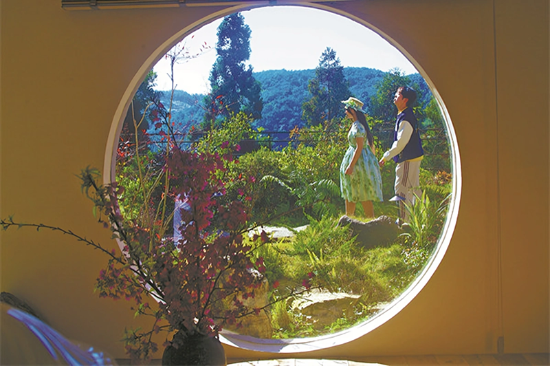 Guests stroll past a pavilion of Shan Yu Hotel that caters to younger visitors seeking micro-vacations. HU MEIDONG/CHINA DAILY