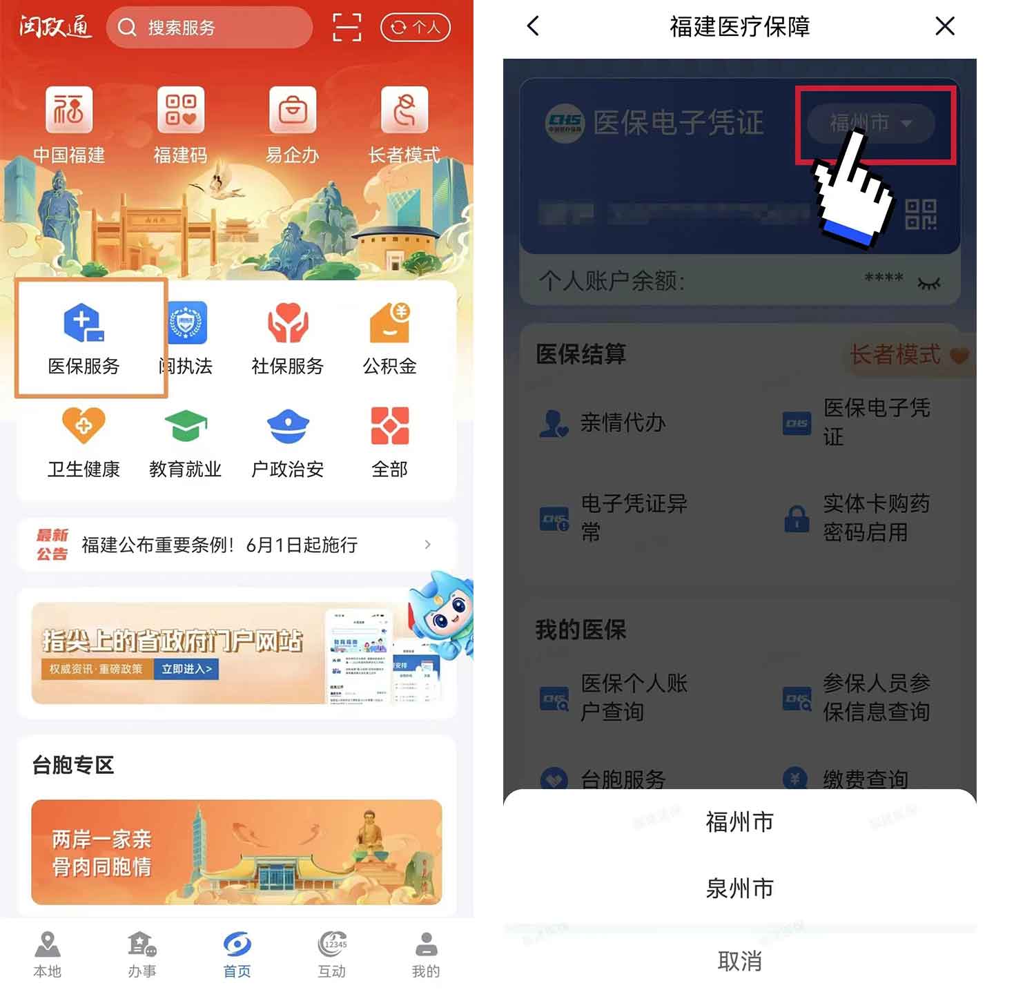 1.打开闽政通APP,首页点击【医保服务】进入。在页面右上角点击【切换参保地】选择需要办理暂停参保业务的地方。