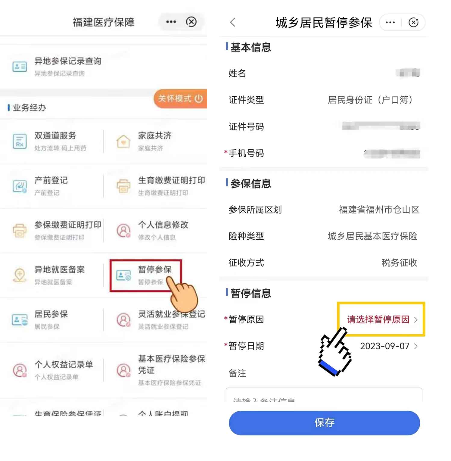 2.在业务经办栏目点击【暂停参保】进入。仔细核对个人信息,选择暂停原因,点击【保存】完成申请。
