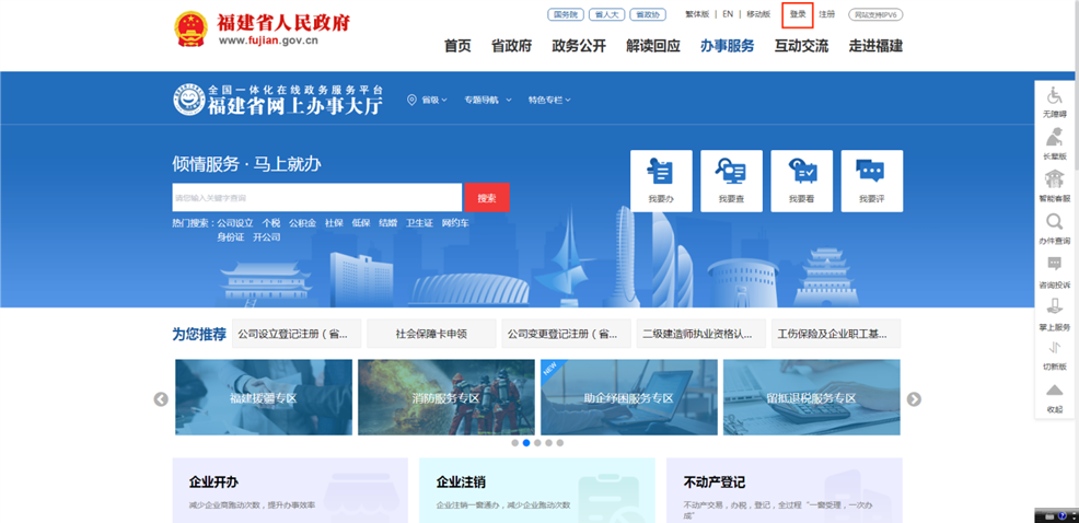 1.登录网页https://zwfw.fujian.gov.cn/,点击右上角“登录”。