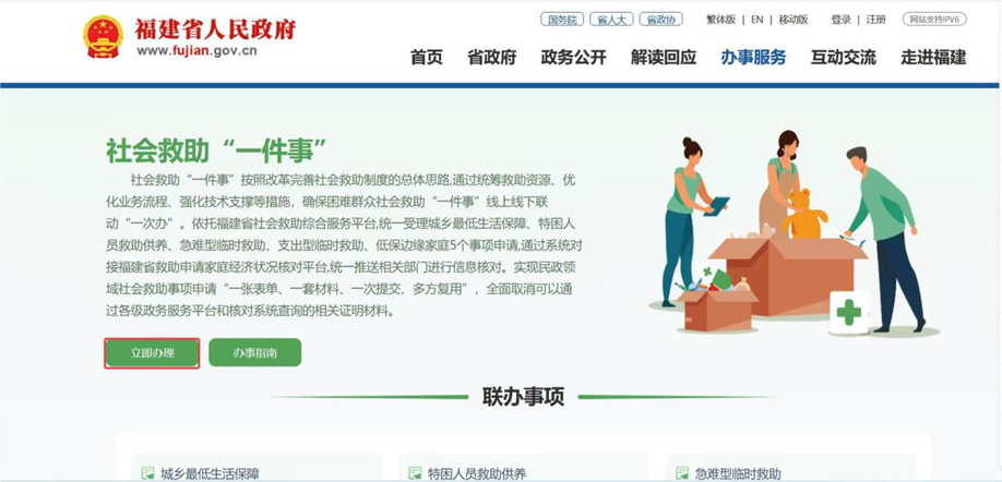 3.选择“高效办成一件事”—“个人事项”—“社会救助一件事”,点击“立即办理”。