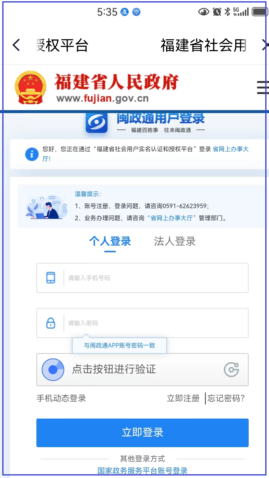 1.登录闽政通APP,输入手机号、密码,点击验证,立即登录。