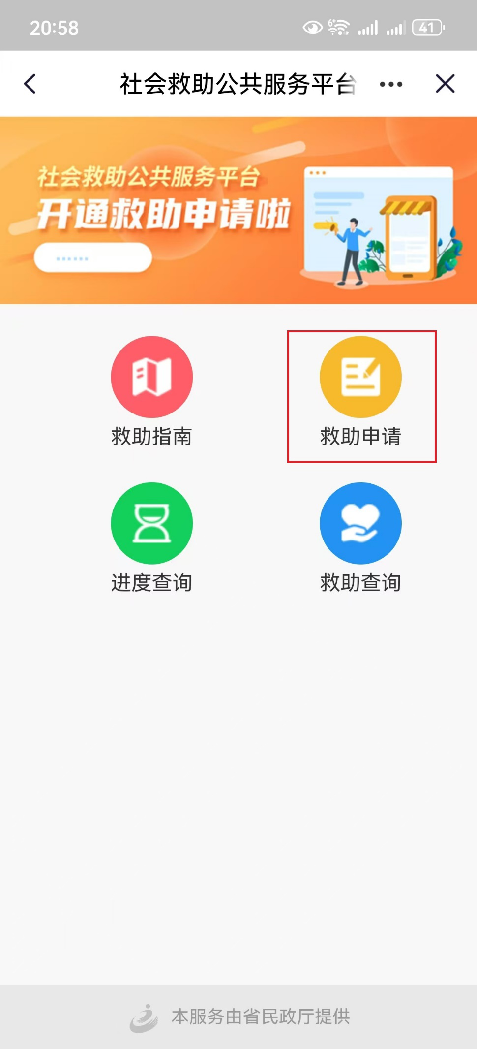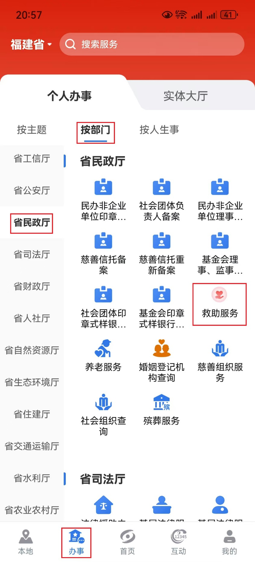 2.选择“办事”—“个人办事”—“按部门”—“省民政厅”—“救助服务”—“救助申请”。