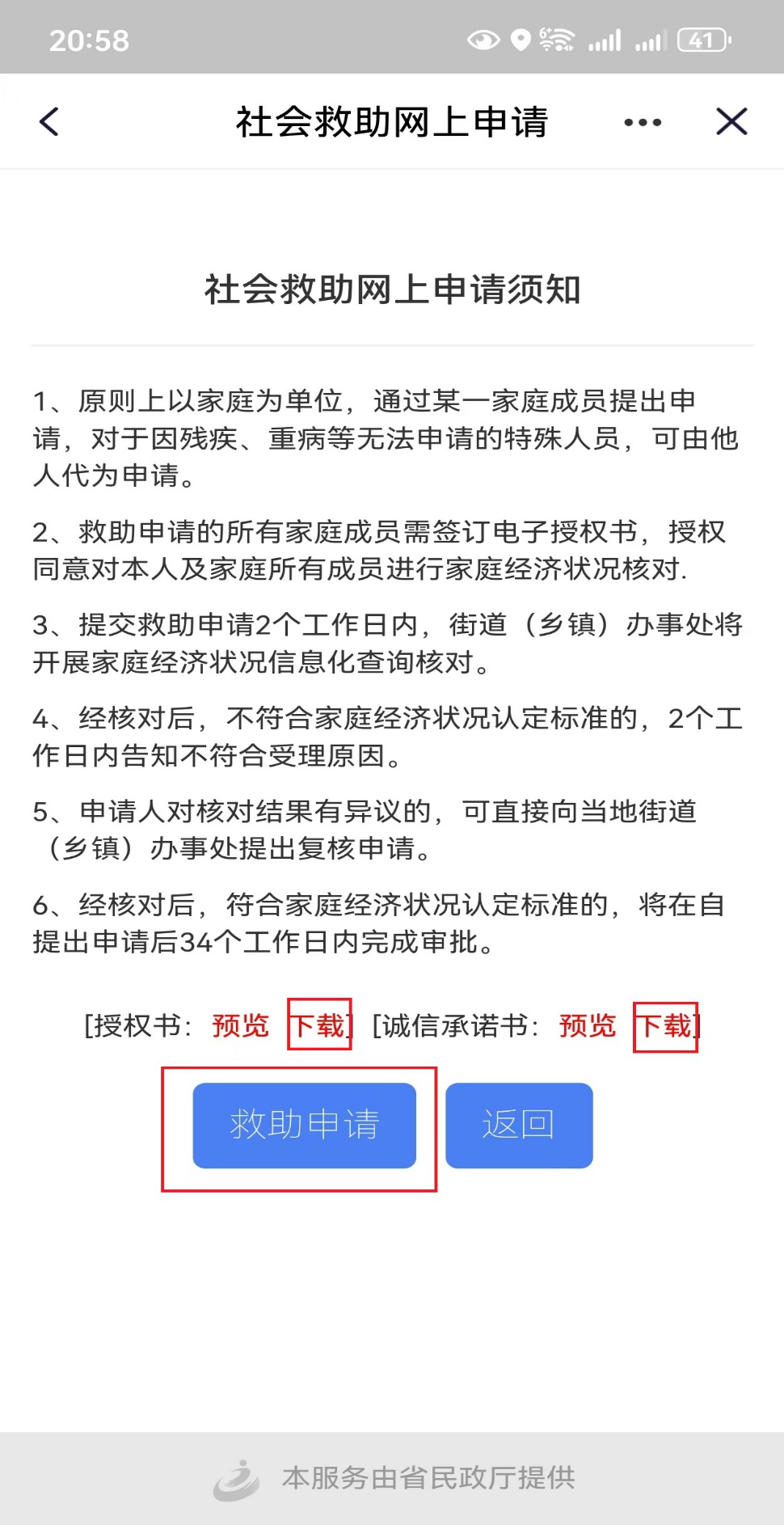 3.下载授权书和诚信承诺书,然后点击救助申请。
