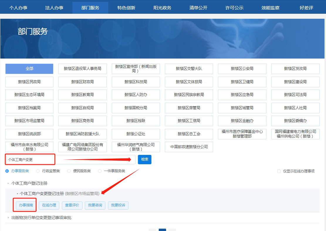 3.在检索框输入“个体工商户变更”关键词——点击“检索”,即可在“个体工商户登记注册”找到“个体工商户变更登记注册(鼓楼区市场监管局)”——点击“办事指南”。