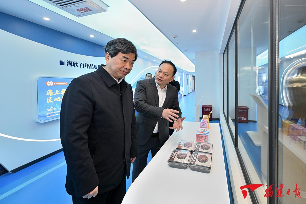 海洋是人类获取食物、蛋白的重要来源。连江渔业产值连续数年位居全国县级前茅,近年来加快布局海洋水产品精深加工产业,培育了鱼丸、鲍鱼等多个单项“冠军”。在福建长恒食品有限公司,周祖翼认真了解水产品精深加工情况,听取企业科技创新、市场经营、食品安全等介绍,不时询问产品销量、出口外销和企业用工等情况。看到高度智能化的鱼丸自动化生产线开足马力、加速生产,冷链仓储车间配送忙碌,以保障源源不断的订单需求,周祖翼鼓励企业坚定发展信心,保持奋斗状态,加大研发投入,进一步提高生产智能化自动化水平,推动海洋水产品的精深和高值化加工。要深挖市场潜力,开发更多口味的新产品,满足消费者多元化需求,不断提升品牌影响力。要筑牢食品安全防线,强化全链条质量管控,让广大消费者吃得放心。周祖翼强调,要牢固树立大农业观、大食物观,大力发展现代海洋渔业,着力提高水产品产量、品质和附加值,更高水平建设“海上粮仓”。