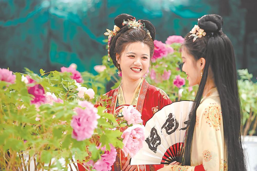 游客在榕城牡丹花展三坊七巷展区赏花。