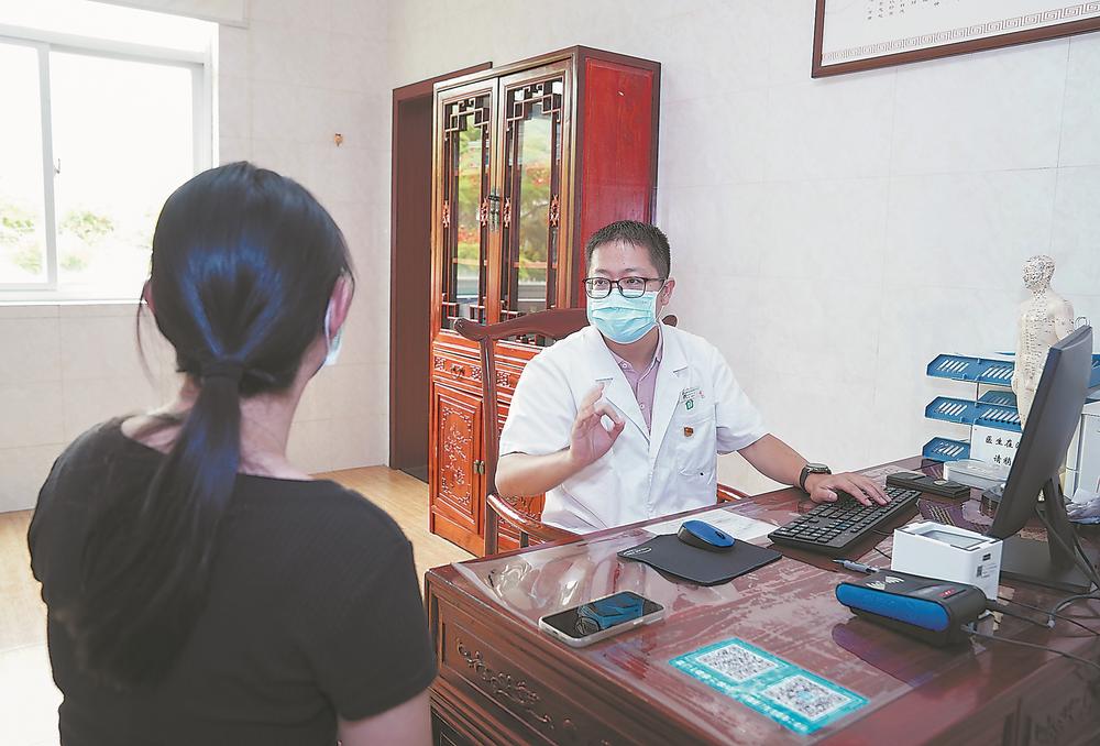 石塘社区卫生服务中心主治中医师李玉正在问诊并通过信息化平台开方。