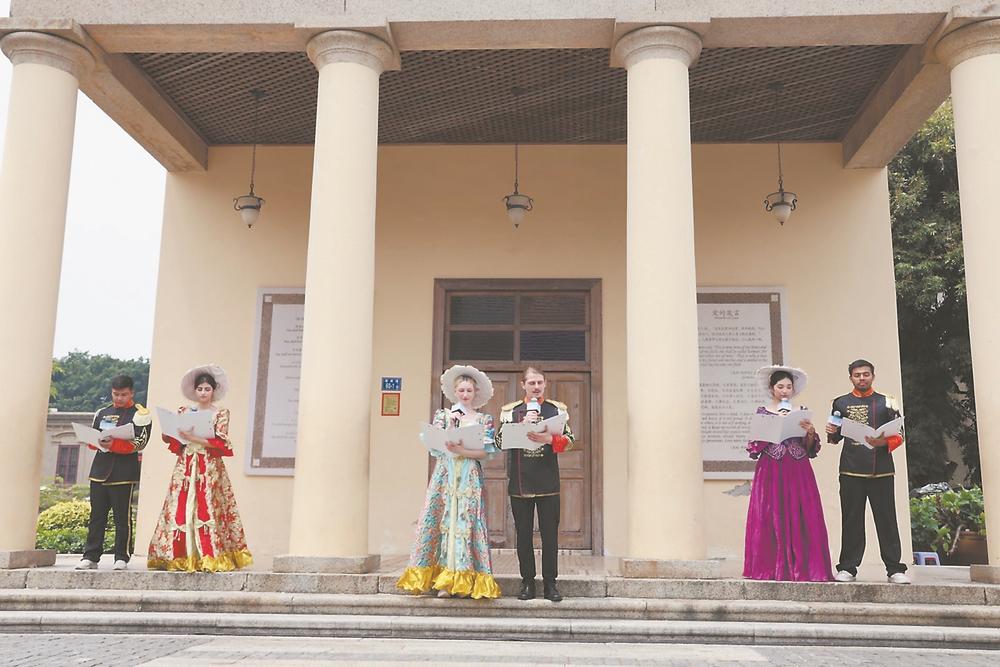 协和礼拜堂前,6位外国友人身着西洋服饰,合诵中英诗歌。(受访者供图)