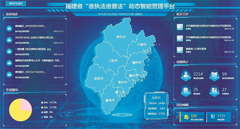 对此,福建锚定“法治福建建设先行示范”目标,将普法成效纳入党政“一把手”年终述职评议和绩效考核,按照“谁执法谁普法、谁管理谁负责、谁服务谁普法”原则,在全国率先以动态智能普法管理平台为工作中枢,以绩效考核为抓手,有效推动普治融合,打通了法治政府和法治社会建设的桥梁,从源头上解决法治建设“最后一公里”问题:“谁来普?”“普什么?”“怎么普?”