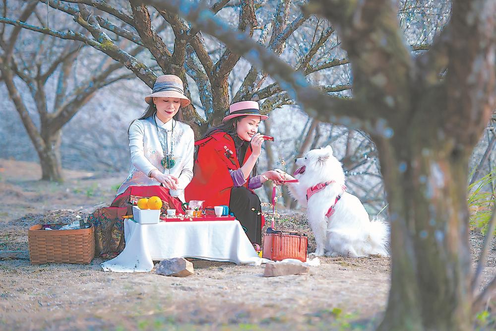 青梅树下,或品茗,或遛狗。