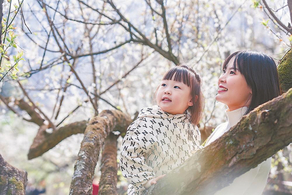 母女俩穿行梅园中,近距离欣赏青梅的风姿和韵味。