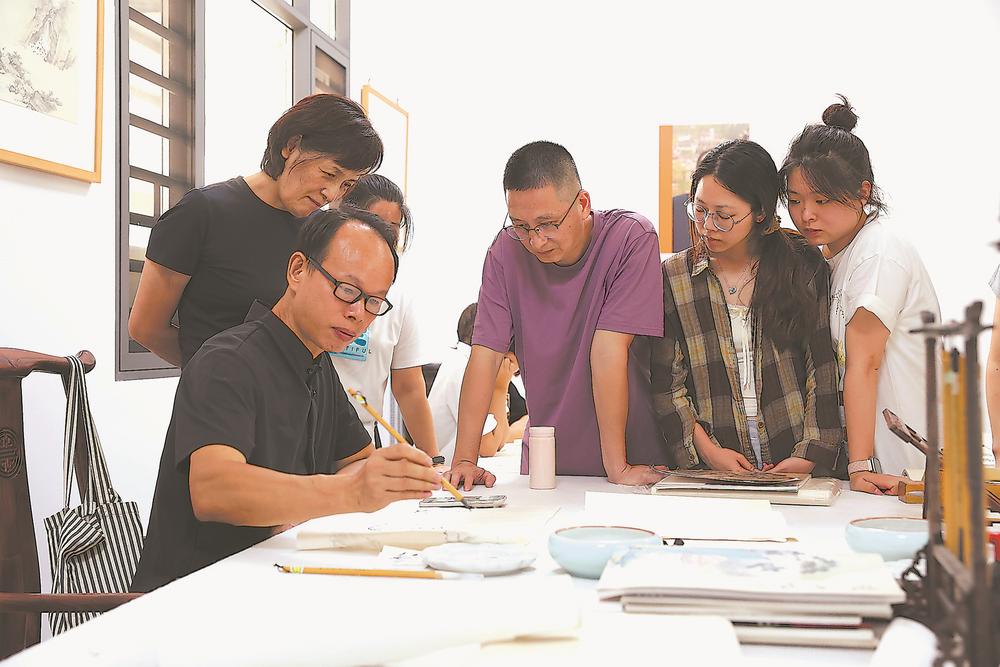 在沈锡纯沈冰山纪念馆,画家林木炎正悉心指导学生运笔作画;在耘墨轩画廊,古画修画师沈丕加小心翼翼地修复一幅来自潮汕地区的清代古画;在个人工作室,画家涂艺泉正在瓷瓶上创作,将书画与瓷器巧妙结合,年销售额数十万元……