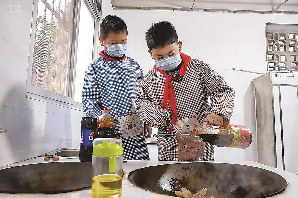 邵武市严羽小学学生在和平中心小学学习做饭。曾子欣 摄