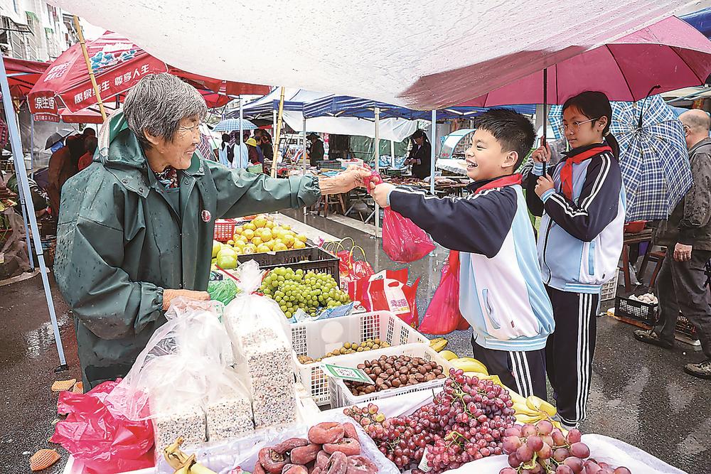 邵武市严羽小学学生在和平古镇集市买菜。曾子欣 摄