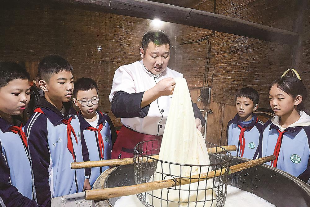 邵武市严羽小学学生在和平古镇体验游浆豆腐制作。曾子欣 摄