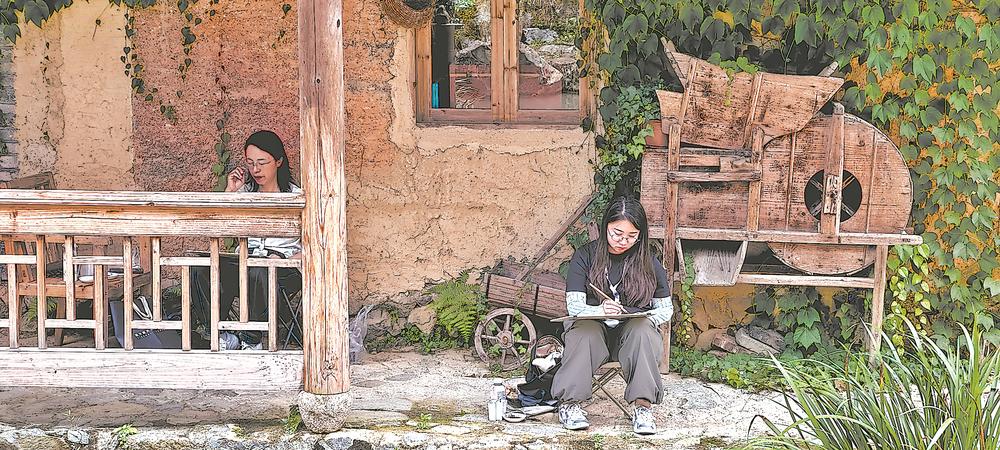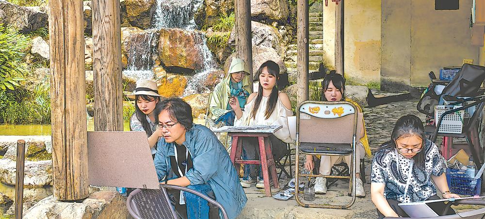 叠水飞瀑旁,数字游民在写生。记者 郭斌 摄