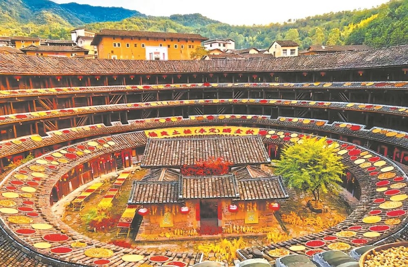 15日,福建土楼永定景区启动晒秋民俗文化季活动,通过沉浸式场景打造全国最大环形晒秋景观。